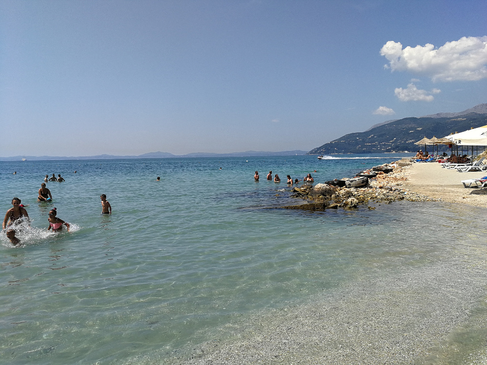 La piccola baia, in cui è incastrata la spiaggia attrezzata, è magnifica! Il mare ha tutte le sfumature di blu, azzurro e turchese. Il fondale è sassoso, ma superati i primi metri (di dolore ai piedi!) si arriva su un enorme lastra rocciosa che consente di muoversi con più facilità.