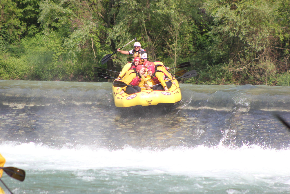 Arrivati a Solagna ci accoglie il personale cordiale e sorridente di Ivan Team, il Centro Rafting più grande ed attrezzato d’Italia dove, dopo un’accurata vestizione (muta, giacca da acqua, giubbino salvagente e caschetto) la nostra guida Andrea ci accompagna fino al punto d’imbarco dei nostri gommoni.