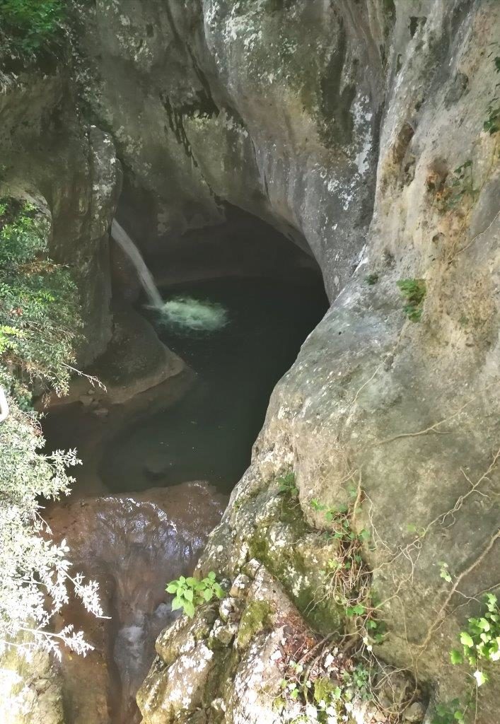 Dopo una tranquilla passeggiata a valle del ruscello, si incontra la “cascata dell’orso”. Dal fianco della cascata parte una ripida scala in ferro aggrappata alla roccia (a prova di vertigini!) che porta fino alla sommità della cascata. Se salendo la scala riuscite a guardare sotto (!!), vedrete il ruscello che forma una vasca naturale, una sorta di pozzo piuttosto profondo, e poi scivola giù lungo il fianco della montagna.